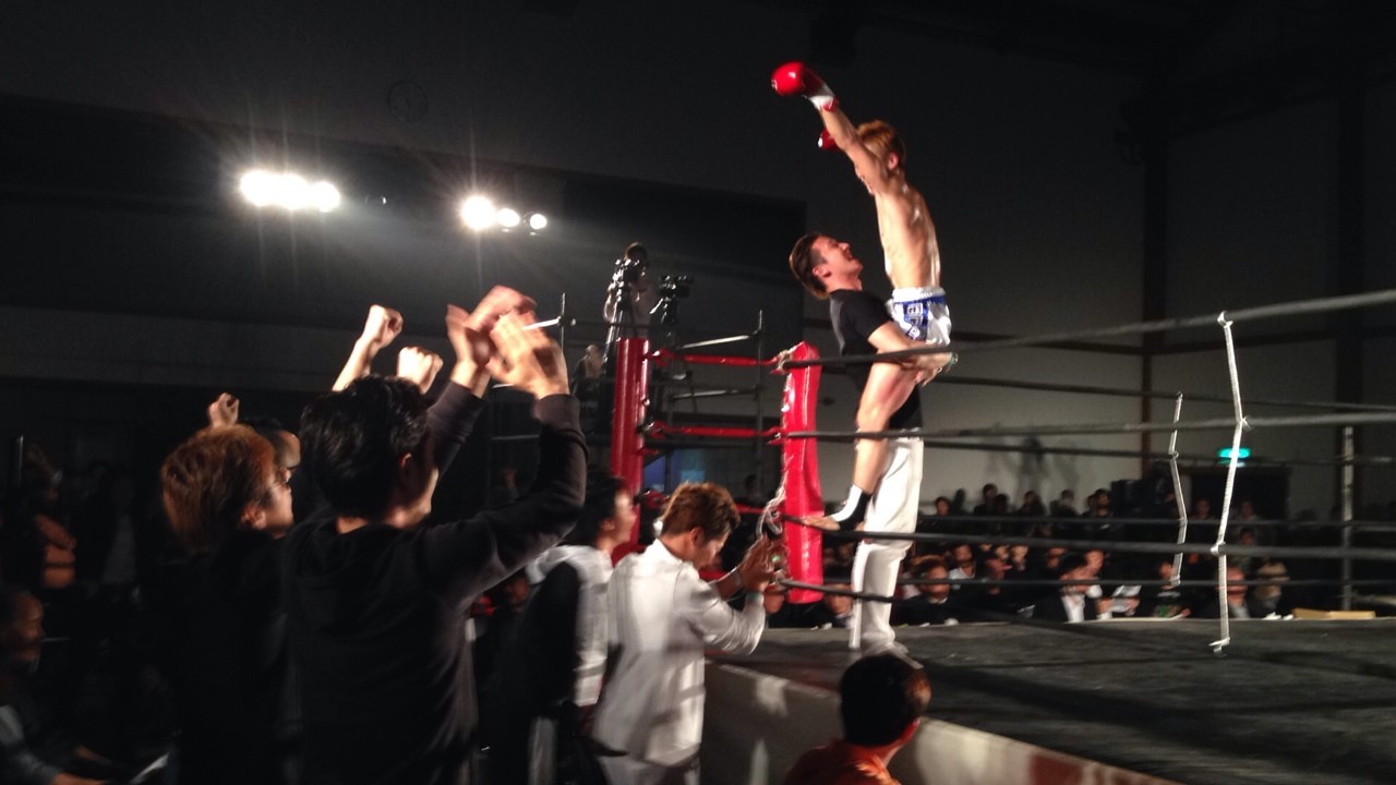 KO勝ちし、RAOU応援団にガッツポーズ!